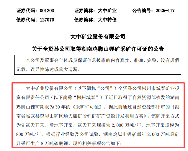 而就在该项目宣布开工的同一天,中赫锂矿的母公司大中矿业(20.220, 0.72, 3.69%)(001203.SZ)发布公告称,全资孙公司郴州市城泰矿业投资有限责任公司(简称“郴州城泰”)于近日取得了自然资源部核发的湖南鸡脚山锂矿期限为30年的《采矿许可证》。