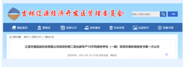 2025年9月19日讯:9月10日,吉林辽源经济开发区管委会官网发布辽源天楹氢能科技有限公司高效利用二氧化碳年产18万t绿色甲烷(一期)项目环境影响报告书第一次公示。