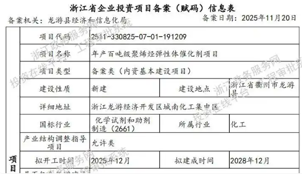 11月20日,衢州星传聚龙新材料有限公司年产百吨级聚烯烃弹性体催化剂项目备案获批!