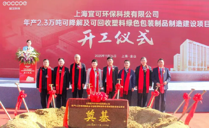 2025年11月27日讯:11月26日,上海宜可环保科技有限公司在金山区朱泾镇举行《年产2.3万吨可降解及可回收塑料绿色包装制品制造建设项目》的开工奠基仪式!政府领导、行业代表、集团董事长严德平、总经理王炳辉、公司其他管理层及员工代表等共同见证了这一重要时刻。